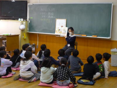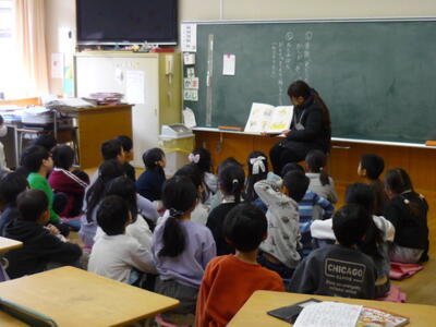 読み聞かせボランティアの皆さんによる「読み聞かせ」がありました。子供たちは、興味深く聞いていました。中には正座をして真剣に聞き入る子供がいるクラスがありました。また、別のクラスでは、ボランティアの方の呼びかけに大きな声で答えているクラスもありました。