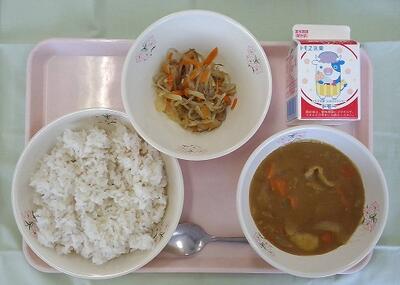献立は、カレーライス・牛乳・もやしのソテーです。