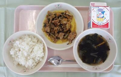 本日の給食は、ごはん・牛乳・スタミナ焼き肉・わかめスープです。