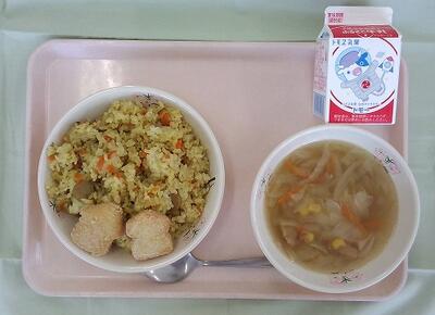 本日の給食は、カレーピラフ・牛乳・いかナゲット・野菜スープです。