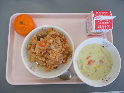 チキンライス 牛乳 コーンシチュー みかん