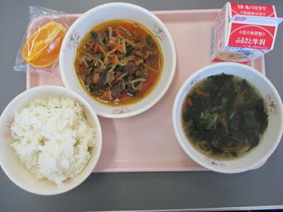 ごはん 牛乳 プルコギ わかめスープ ネーブルオレンジ