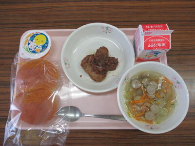 今日は本町小学校独自献立です。来週から読書月間が始まるので、それに先駆け、子どもたちに人気の本「ルルとララ シリーズ」からトーストとゼリーを採用しました。メープルトーストは本町小給食室のオーブンで調理員さんが1枚1枚食パンにバター・シロップ・砂糖を塗って焼きました。子どもたちや先生にもとても好評でした。