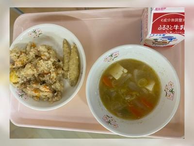 くわいごはん 牛乳 わかさぎの天ぷら 豚汁