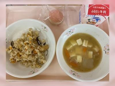 今日は、まごわごはんです。まごわごはんには、大豆、ひじき、ごぼう、さつまいも、しいたけ、ちりめんじゃこが入っています。