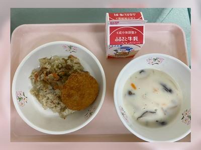 とりごぼうピラフ 牛乳 カレーコロッケ 白いんげん豆ときのこのクリームスープ