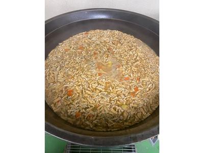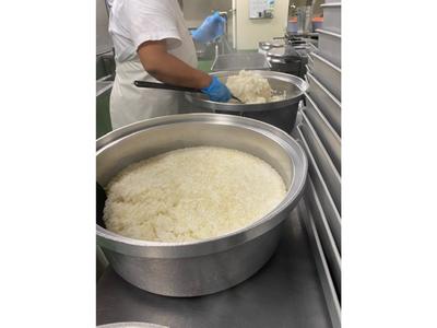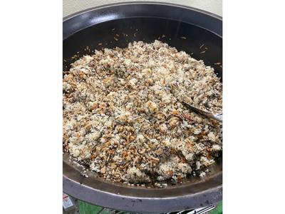 米と具材をへらを試用してよく混ぜます。混ぜ合わせるのは大変ですが、おいしくなるように心を込めています。
