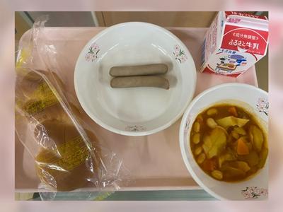 カラーピラフには、ソーセージ、鶏肉、玉ねぎ、にんじん、ピーマンが入っています。ごはんにカレー粉を加えて炊いています。子供たちから好評で、どのクラスもおかわりをしている児童が多かったです。