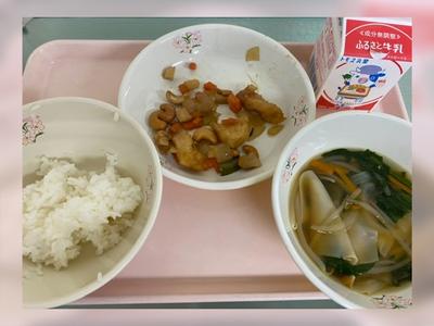 ごはん 牛乳 とりとカシューナッツの炒め煮 ワンタンスープ