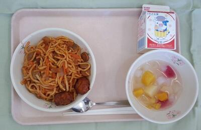 本日の給食は、スパゲティナポリタン・牛乳・レモンとバジルのチキンナゲット・フルーツカクテルです。