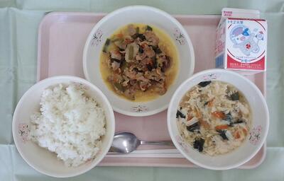 本日の給食は、ごはん・牛乳・スタミナ焼き肉・かきたま汁です。