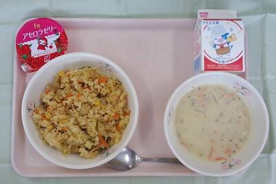 本日の給食は、メキシカンライス・牛乳・豆乳クリームスープ・アセロラゼリーです。