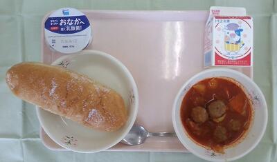 本日の給食は、揚げパン(グラニュー糖)・牛乳・ミートボールのトマト煮・ヨーグルトです。
