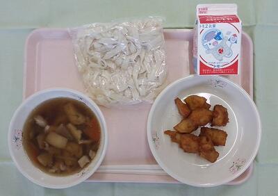 本日の給食は、おっきりこみ・牛乳・みそポテトです。