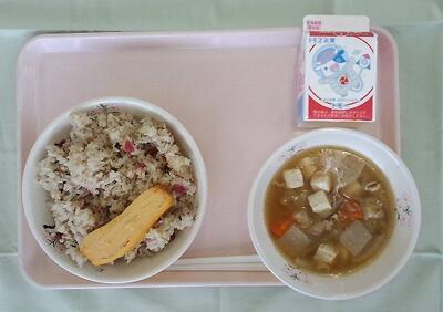 本日の給食は、ごはん・牛乳・とうふのあんかけ・みそけんちん・狭山茶ふりかけです。
