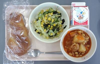 本日の給食は、ツイストパン・牛乳・ポークビーンズ・じゃこサラダです。