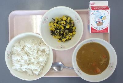 本日の給食は、カレーライス・牛乳・小松菜のソテーです。