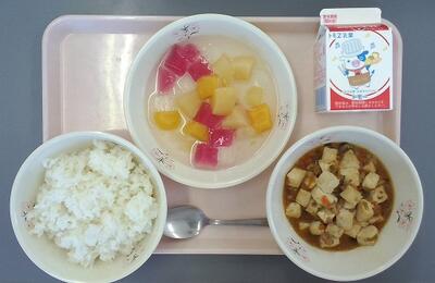 本日の給食は、ごはん・牛乳・マーボーどうふ・フルーツカクテルです。