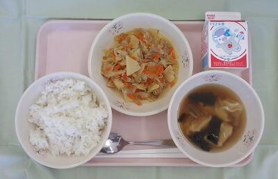 本日の給食は、ごはん・牛乳・肉野菜炒め・水ぎょうざのスープです。