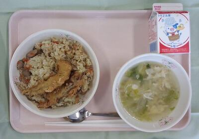 本日の給食は、とりごぼうピラフ・牛乳・ししゃもフリッター・たまごとレタスのスープです。