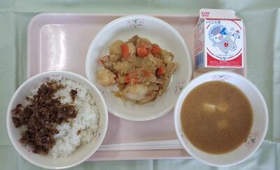 本日の給食は、ごはん・牛乳・肉じゃが・なめこ汁・エコふりかけです。