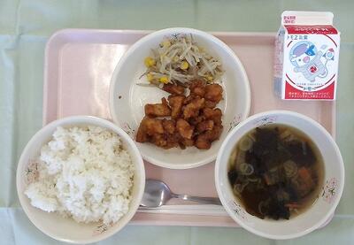本日の給食は、ごはん・牛乳・ユーリンチー・もやしのソテー・わかめスープです。