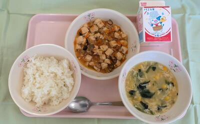 本日の給食は、ごはん・牛乳・マーボーどうふ・中華風コーンスープです。
