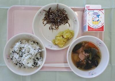 献立は、わかめごはん・牛乳・田作り・おぞう煮・くりきんとんです。