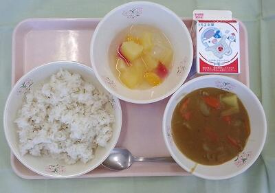 本日の給食は、カレーライス・牛乳・フルーツカクテルです。